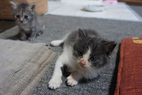 更新まったくもって遅くなってますが… なぜならば… 里親決まりました♪♪♪ ありがたや、ありがたや…っっ 鼻の上にカルカンついてるため 茶色く汚れてますが、本当は顔は真っ白な子なのです… チビちゃんは、このまま我が家で育てることにしました。 内臓系が弱…